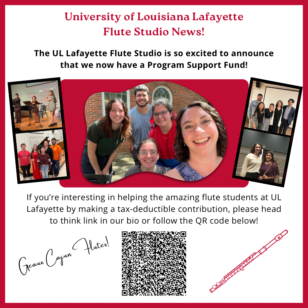 If you think you would like to study flute in an environment like what I’ve just described, please do not hesitate to contact me! I’d love to tell you why the University of Louisiana Lafayette would be a fantastic place for you to study the flute!